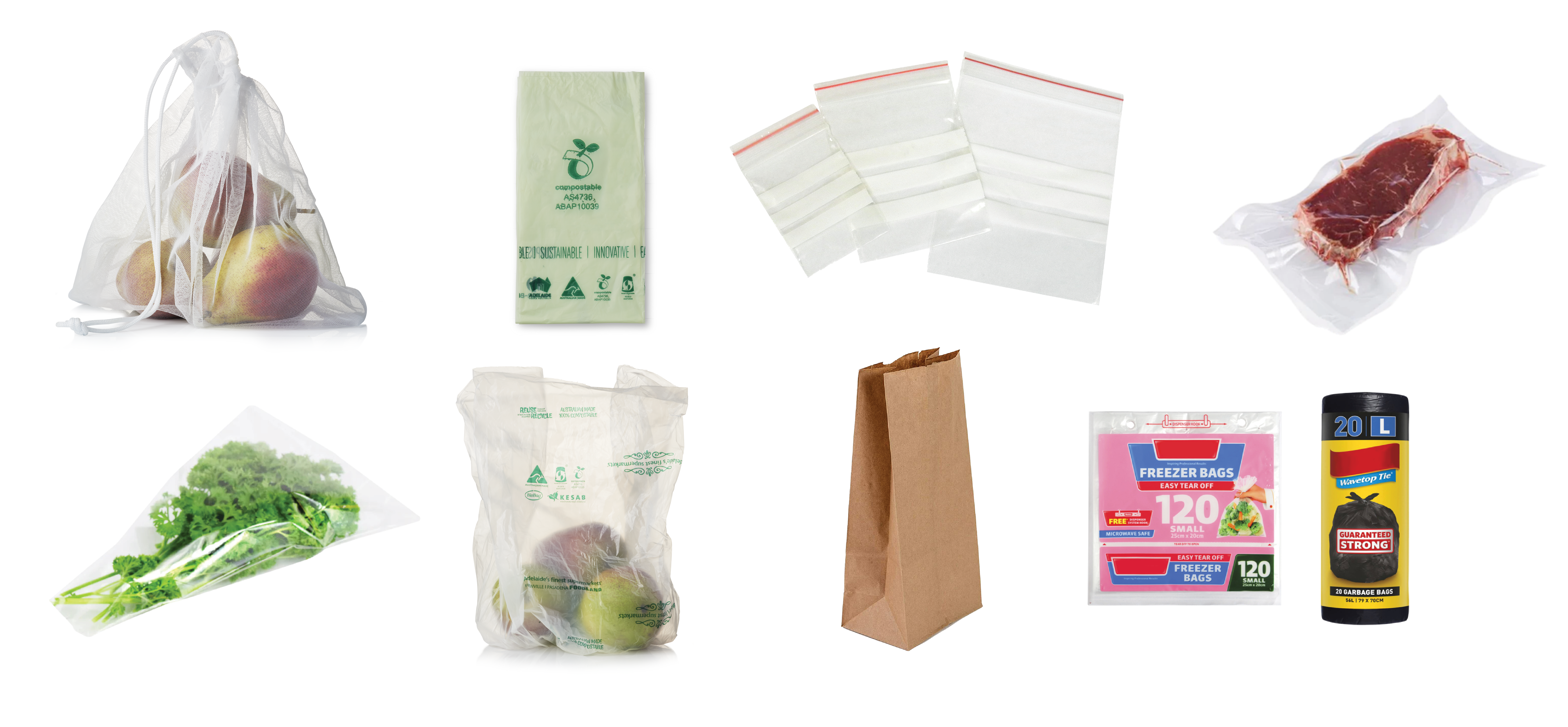- Multipacks of plastic bags sold on-shelf (such as freezer bags, storage bags, zip-lock bags, bin liners, garbage bags, nappy bags)